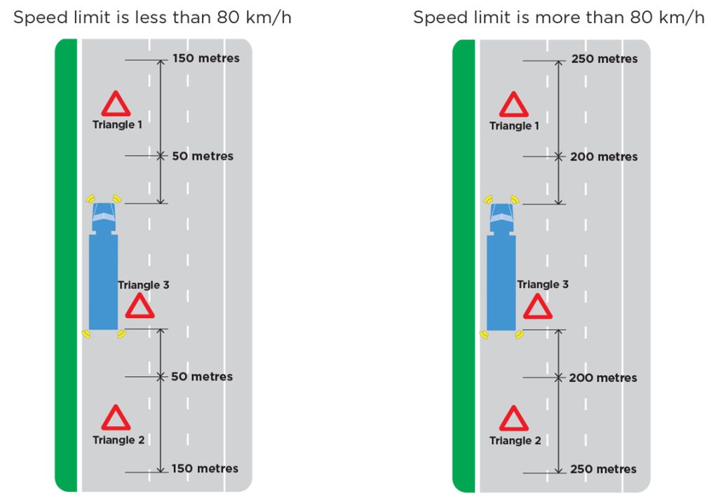 A vehicle with a GVM of more than 12 tonnes must carry three portable warning triangles. Tegral stocks kits of these, seen here. These triangles must be used when the vehicle has stopped, broken down or its load has fallen on the roadand cannot be seen (in all directions for at least 200-300m) by other road users.