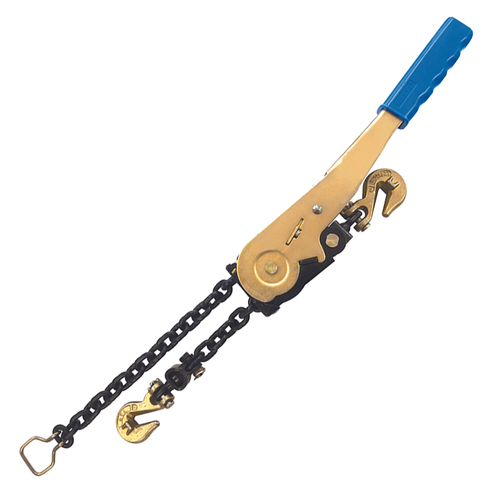 A ratchet binder often referred to as a ratchet dog, uses a ratcheting mechanism to exert tension in the chain and secure the load. It has two tension hooks on each end and a ratchet handle. The possibility of the bar recoiling or snapping back is decreased by the ratchet style’s design, which does not store as much tension in the handle as the other type.